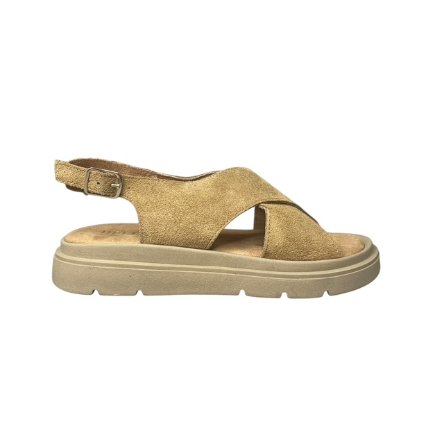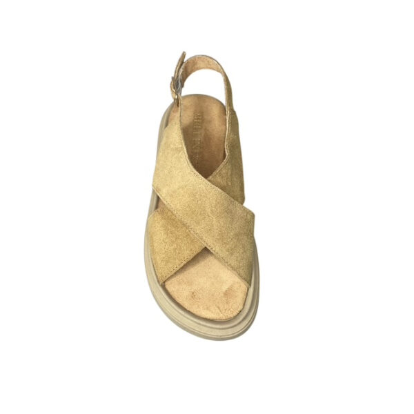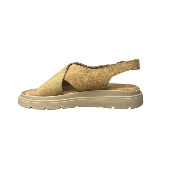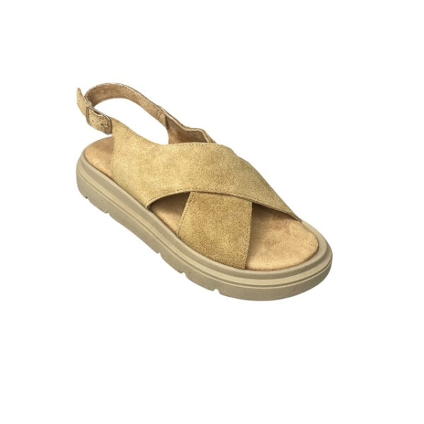 Η σταθερή σόλα latex προσφέρει ευκαμψία, απορρόφηση κραδασμών και στήριξη στο βάδισμα, ενώ το λουράκι φτέρνας εξασφαλίζει ασφαλή εφαρμογή. Το χιαστί σχέδιο και η φυσική cuoio απόχρωση κάνουν το σανδάλι ιδανικό για casual και κομψές καλοκαιρινές εμφανίσεις.