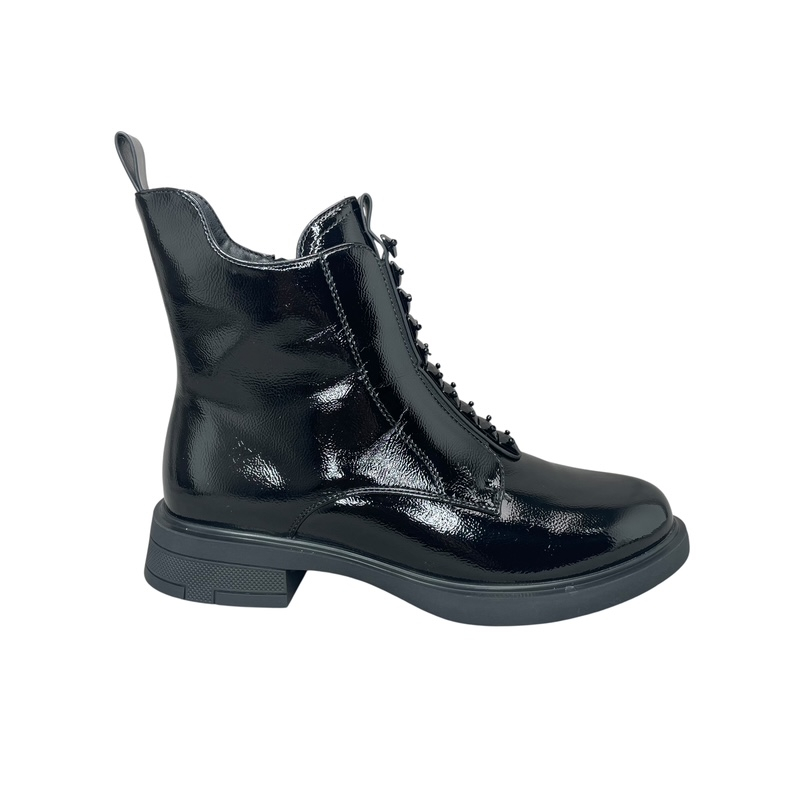 Η λουστρίνι υφή σε μαύρο χρώμα προσφέρει εντυπωσιακή, λαμπερή εμφάνιση, ενώ η γραμμή του παπουτσιού παραμένει minimal και κομψή.