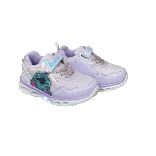 Παιδικά αθλητικά Disney Stitch σε λιλά χρώμα με φωτάκια, αυτοκόλλητο κλείσιμο και αντιολισθητική σόλα. Άνετα και ιδανικά για καθημερινή χρήση με μοναδικό παιδικό design.