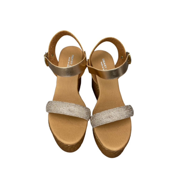 Γυναικείες πλατφόρμες Smart Steps 25329 σε απόχρωση χαλκού, με λαμπερό μπροστινό λουράκι, ψηλή ελαφριά σόλα και ρυθμιζόμενο λουράκι στον αστράγαλο για σταθερή και άνετη εφαρμογή.