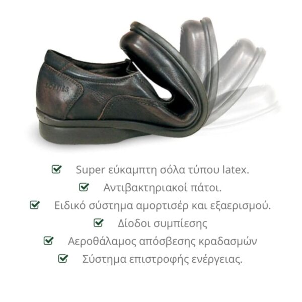 Ο ανατομικός δερμάτινος πάτος προσφέρει σωστή στήριξη του πέλματος, ενώ η αντιολισθητική σόλα εξασφαλίζει σταθερότητα και άνεση στο περπάτημα.